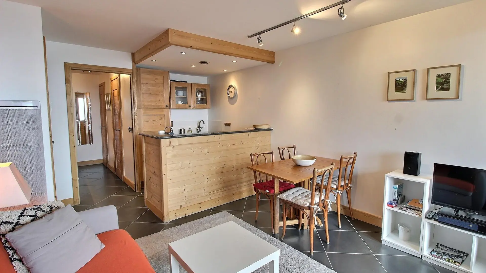 - A fully-equipped living room/kitchen: electric oven, hob, coffee maker, kettle, toaster, dishwasher, fondue/raclette maker, hand mixer, etc.