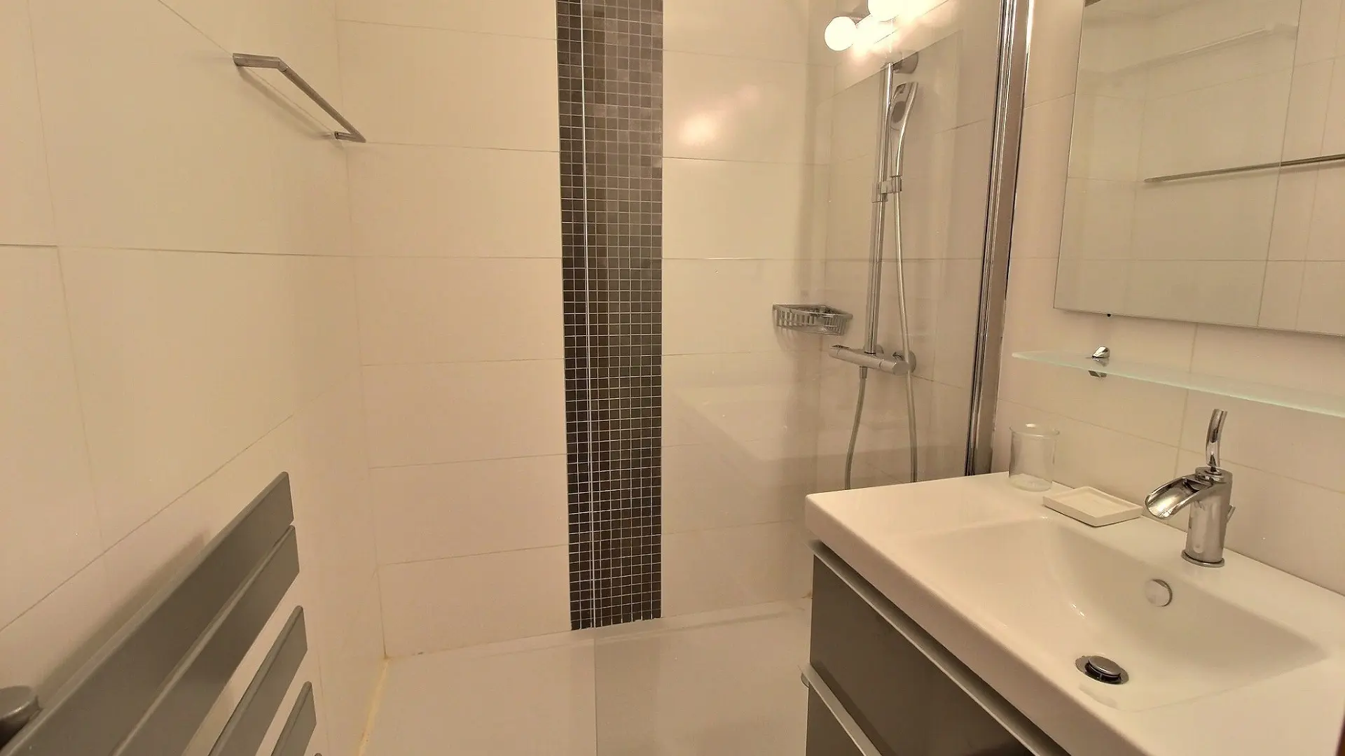 - A modern shower room with heated towel rail